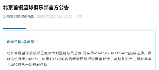 北京男篮官方公告表示:北京首钢篮球俱乐部已为澳大利亚籍球员马帝昂完成注册。目前这位身高208cm、体重102kg的内线新援已经抵达湖南长沙,与球队会合,随时准备上场和球队一起并肩作战!